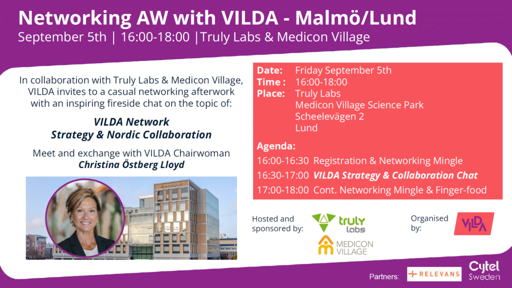 In collaboration with Truly Labs and Medicon Village, VILDA invites to a Networking Afterwork (AW) in Lund together with the Chairwoman of VILDA, Christina Österberg Lloyd. See below!